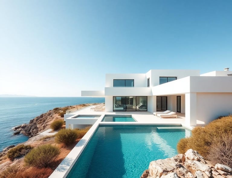 A coastal villa where indoor and outdoor spaces flow seamlessly. White-rendered walls and timber screens filter Mediterranean sunlight throughout the day.